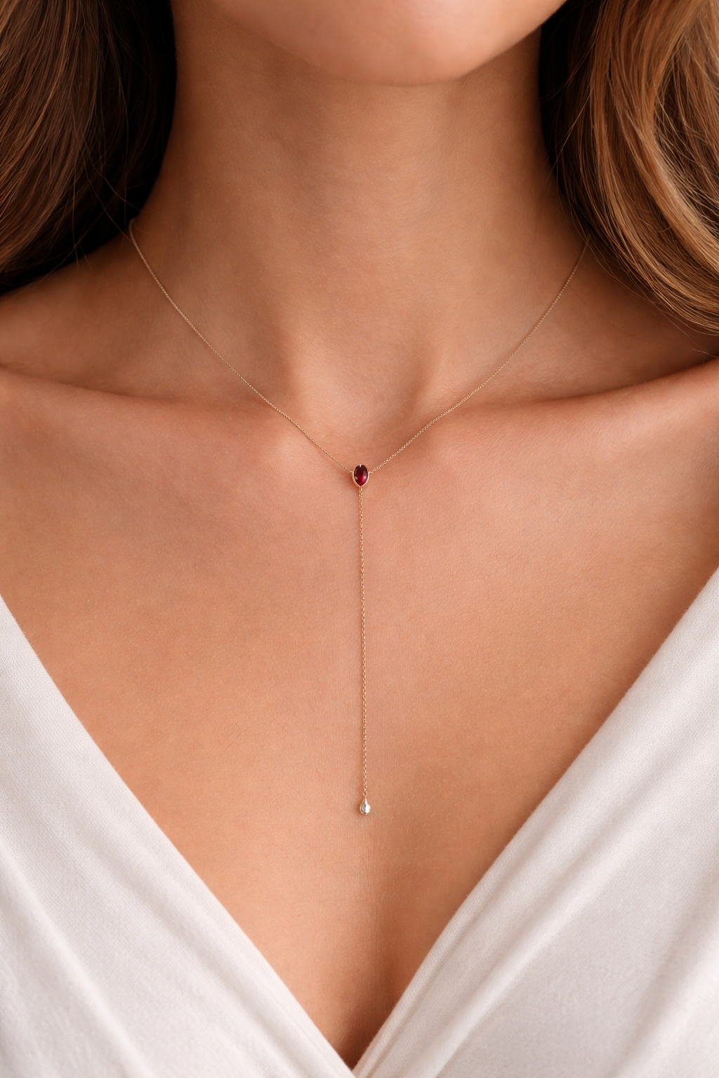 14K Gold Ruby Pear Lariat Y Necklace