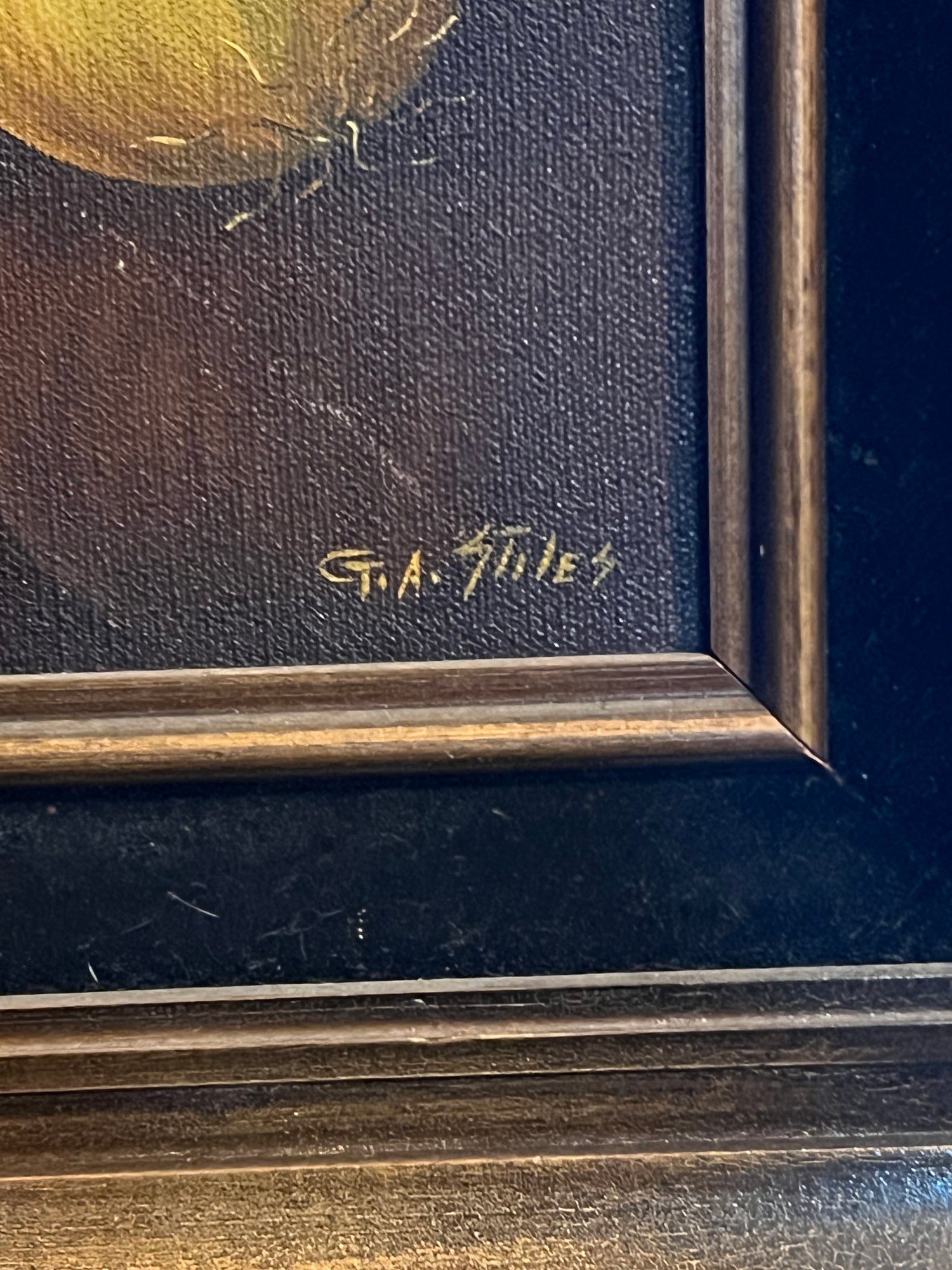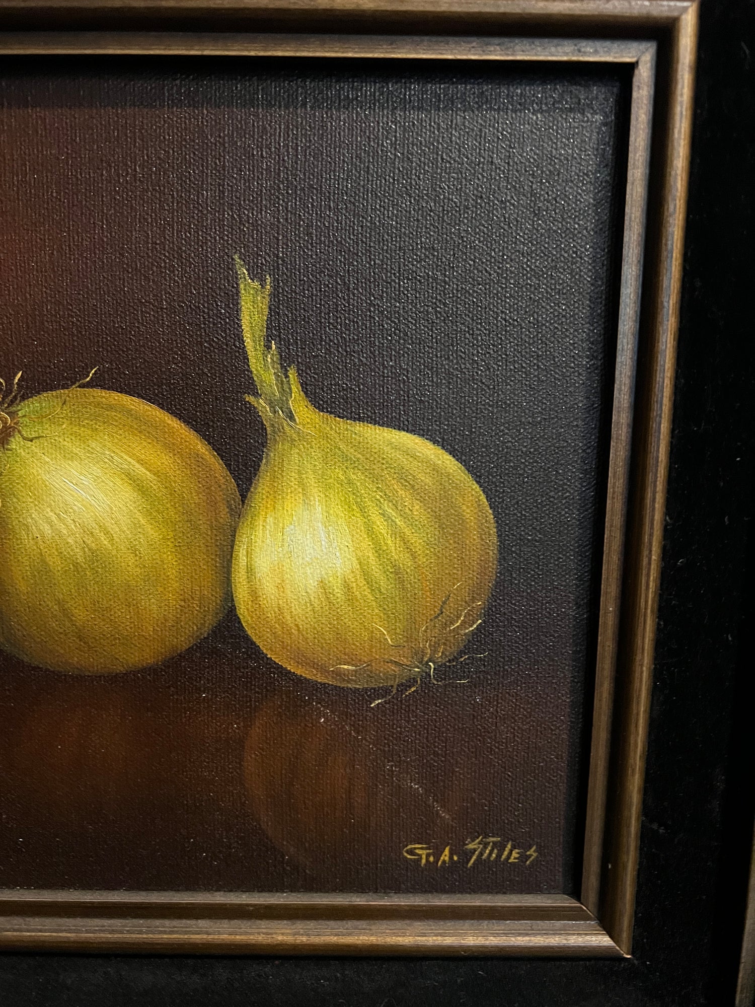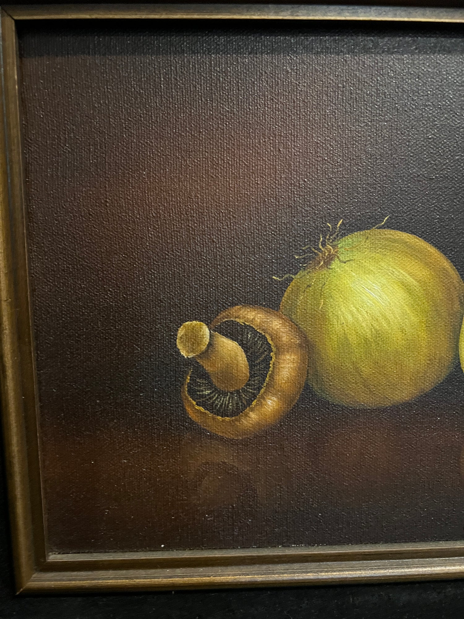 Moody Vintage Still Life Oil Painting, Onions and Mushroom